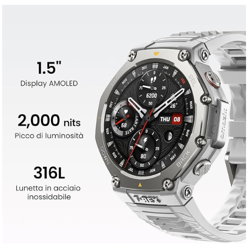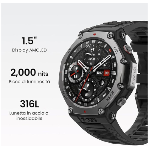 Scopri il nuovo Amazfit T‑Rex 3, l’orologio da avventura di fascia media che sfida i top di gamma. Con cassa da 48 mm in poly-resina e lunetta in acciaio 316L, è certificato militare e resiste in immersione fino a 100 m, con temperature da –30 °C a +70 °C .