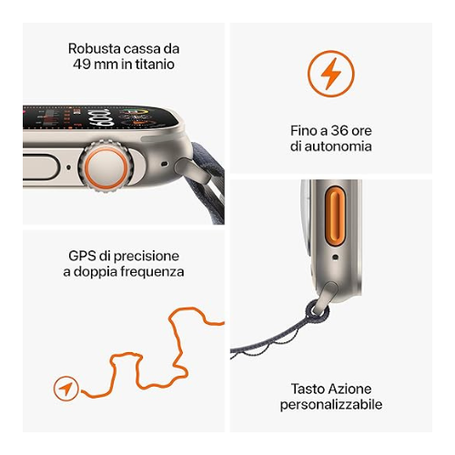 Scopri l’Apple Watch Ultra 2, l’orologio rugged pensato per chi non si ferma mai. Realizzato in titanio grado 5 (colori Natural e Black), con misure 49 × 44 × 14,4 mm e display OLED da 1,92″ (502×410 px), è pronto per l’azione